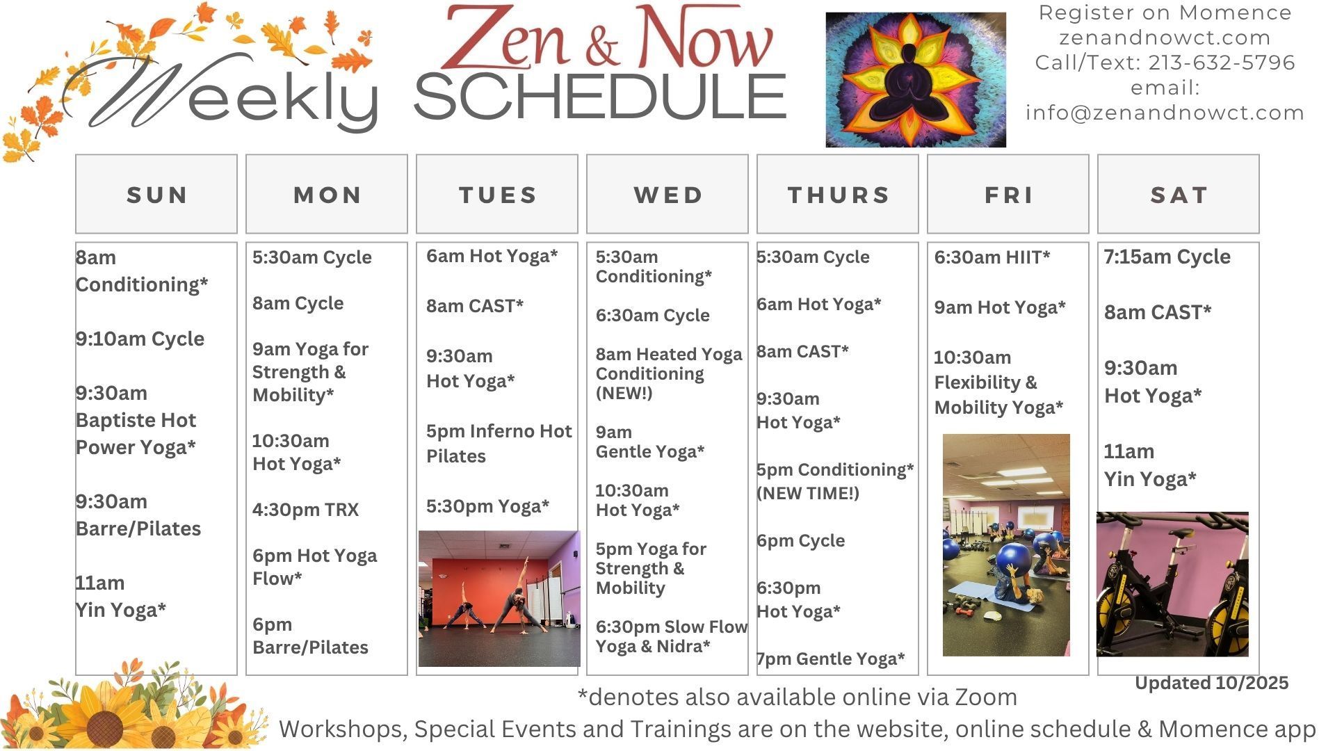 Scroll down to see the "live" schedule and to register for classes. The image above shows our regularly scheduled weekly classes and does not include Workshops and special events or